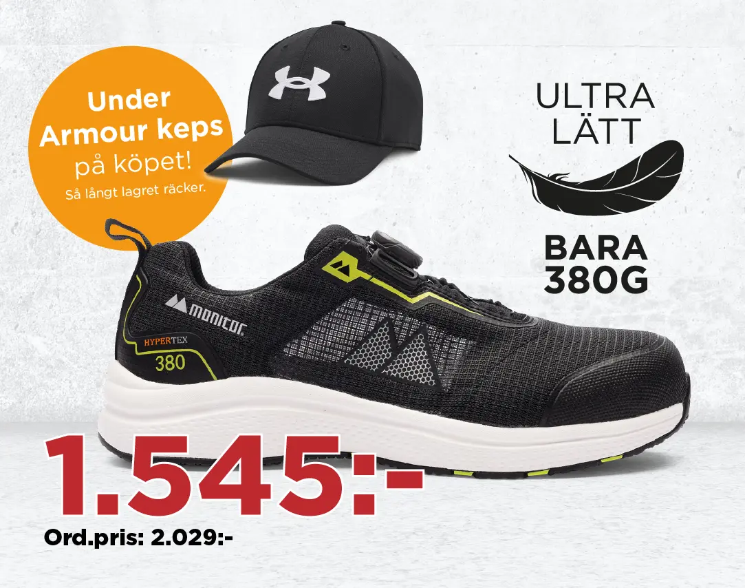 Få Under Armour keps på köpet när du köper skyddssko Three 100 Eighty från Monitor. Erbjudandet gäller så långt lagret räcker.