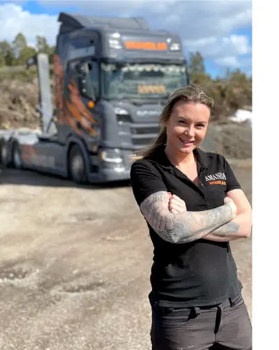 Det är en kvittrande glad Amanda Lagerstrand Borg som berättar att hon kört lastbil i 5 år och att hon älskar det hon gör. Jag var ofta med pappa i hans lastbil och även min farfar körde lastbil så det var det självklara valet för mig. Jag har till och med inspirerat min storasyster att satsa på yrket. Absolut roligast med jobbet är att hela tiden få se nya vackra platser i Sverige, säger Amanda. Jag kör för ett mindre åkeri i Eksjö som heter Lasses Kranbilar och jag är den enda tjejen där som kör lastbil. Ena dagen är aldrig den andra likt och friheten att kunna stanna till där jag själv väljer passar mig väldigt bra. Baksidan att vara tjej i detta yrke är otryggheten jag kan känna när jag bor över i lastbilen, vilket jag ju gör fyra nätter i veckan.
